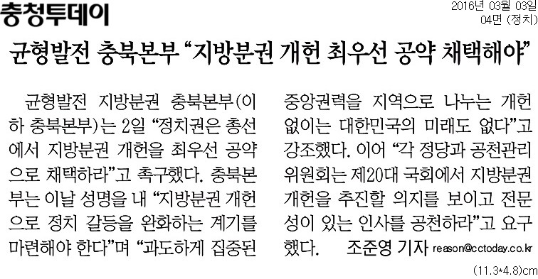 균형발전 충북본부 "지방분권 개헌 최우선 공약 채택해야"(3/3_충청투데이)