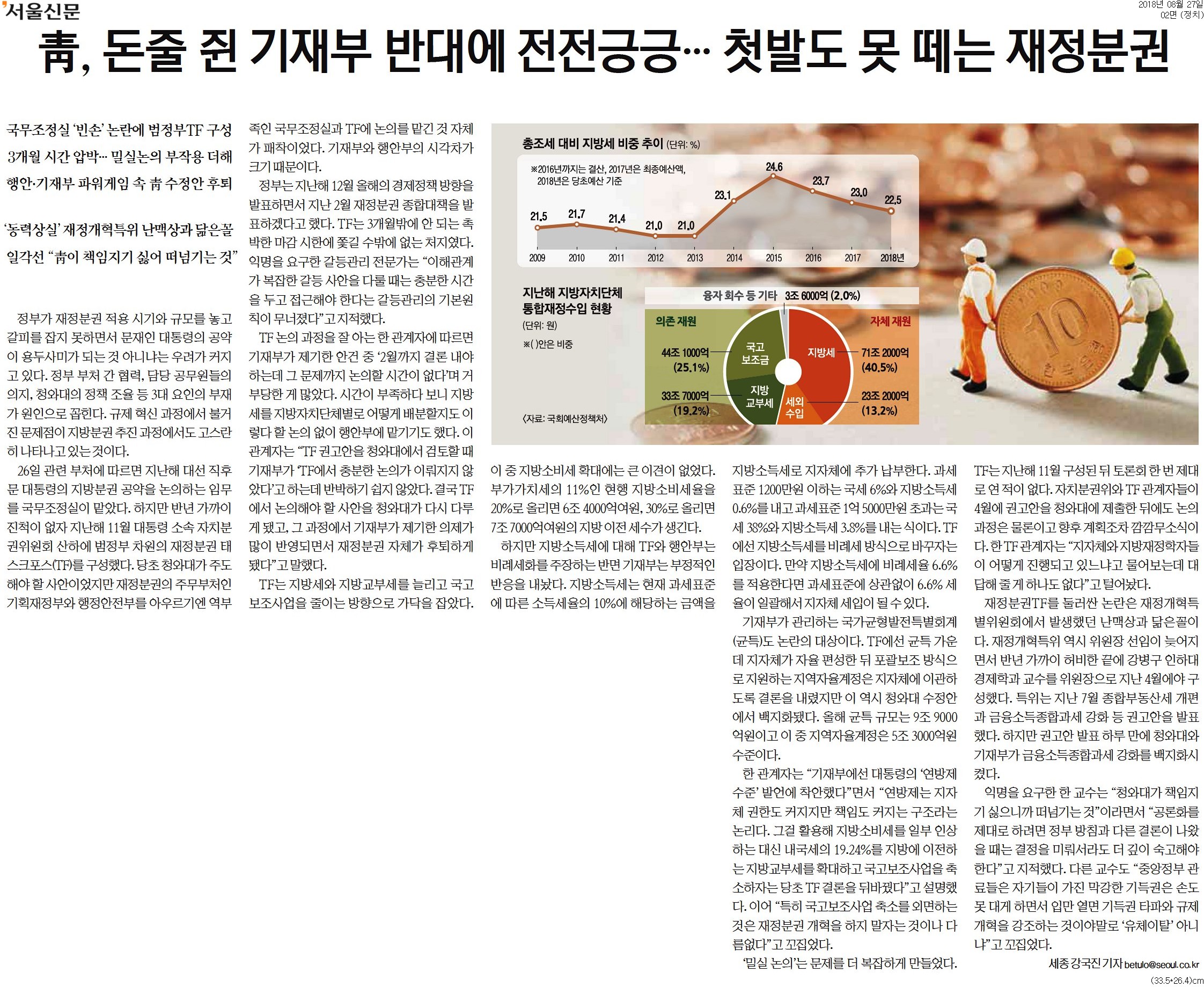 청, 돈줄 쥔 기재부 반대에 전전긍긍..첫 발도 못 떼는 재정분권(180827_서울신문)